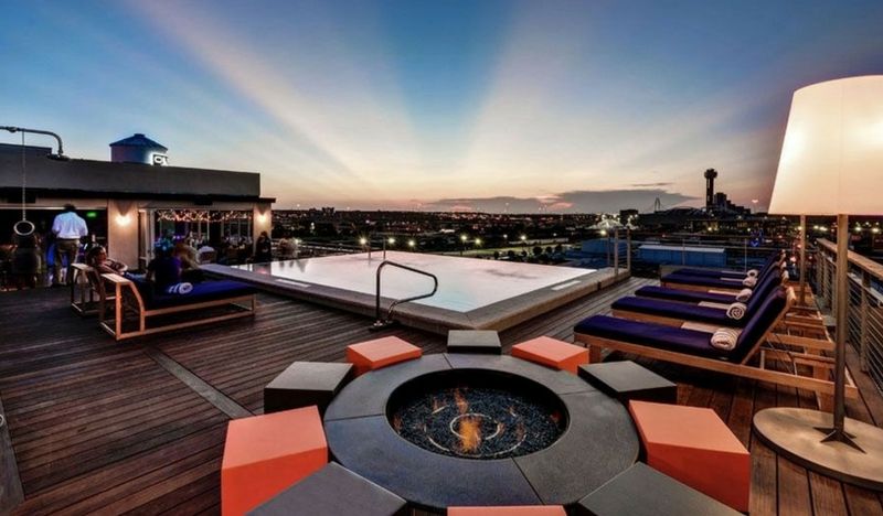 Visitors can unwind and relax at this ultra modern rooftop bar complete with foosball tables, faux grass, and Texas brews. Located on top of the century-old Dallas Coffin Co. building this rooftop looks out onto the twinkling lights of downtown Dallas. Relax near the rooftop infinity pool; pull up a seat at the unique blue lighted bar or stretch out around the glowing fire pit.